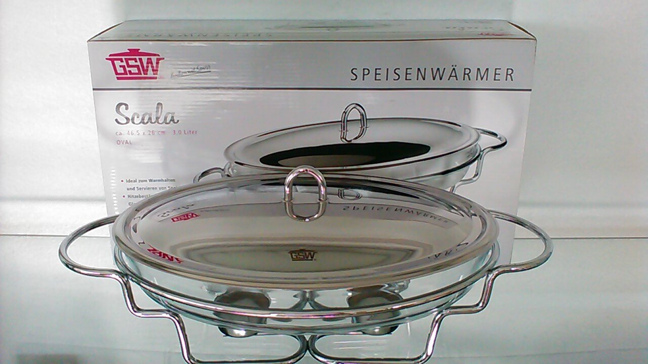 Chauffe plat ovale GSW avec plat en verre et couvercle inox.